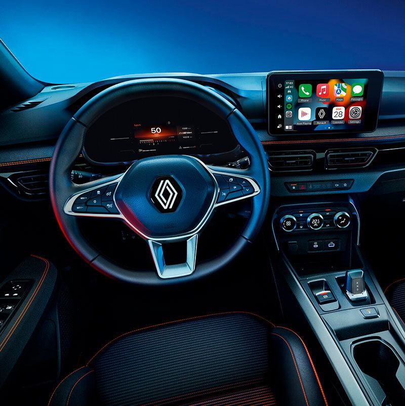 marca un antes y un después con sus líneas ágiles, modernas y dinámicas. Su vibrante color naranja energy aporta un toque de originalidad y distinción. En la parte delantera, el paragolpes cuenta con una parrilla completamente nueva que presenta el nuevo emblema de Renault, enmarcada por diamantes geométricos que reflejan la luz. La iluminación de doble nivel es full LED.